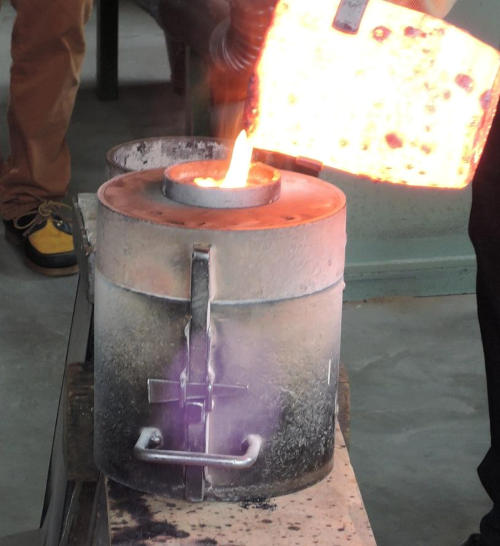 Grad heisse, flüssige Metall (Bronze) vom Schmelztiegel in